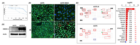 Protein expression of HMOX-1 in parental (P) and resistant A375 (R) cell lines. (A) MTT assay was assessed on parental and resistant A375 cell lines after treatment with different concentrations of vemurafenib for 3 days. This experiment was performed in triplicate and independently repeated three times. (B) IF with BRAFV600E antibody. Cells were synchronized and then stimulated with FBS for 3 h. Scale bar = 20 μm (C) Human XL oncology array (relative levels of 84 human cancer-related proteins) incubated with total protein extractions collected from parental and resistant A375 cell lines. (D) HMOX-1 protein levels in parental A375 cells and resistant A375 cells.