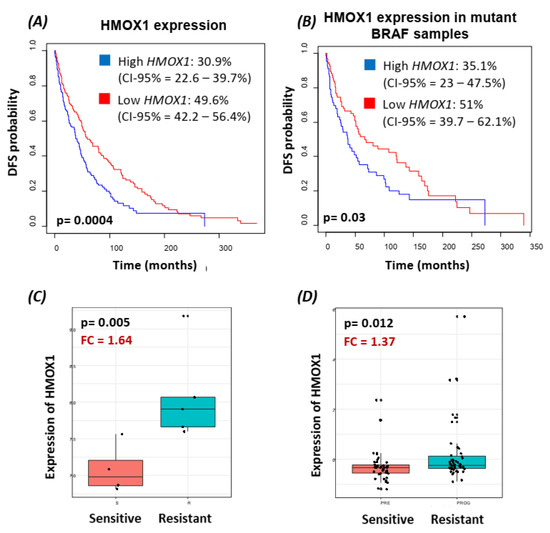 Transcriptomic analysis on public datasets highlighted the role of HMOX-1 in aggressiveness and BRAF inhibitor resistance in melanoma. (A,B) Kaplan–Meier curves representing the disease-free survival (DFS) of patients with a high expression of HMOX-1 compared to samples with low expression of HMOX-1 in a TCGA melanoma cohort (406 samples with survival information) (A) and in BRAF mutant samples (165 samples) (B) HMOX-1 expression was stratified as “high” and “low” with an optimized cut-off. (C) Boxplot representing the distribution of HMOX-1 expression in sensitive and resistant mice after A375 cell inoculation and BRAF inhibitor treatment (GSE74729, 4 sensitive and 5 resistant samples). (D) Boxplot representing the distribution of HMOX-1 expression in sensitive and resistant patients in a merge of 3 melanoma patient datasets (43 BRAF inhibitor sensitive (before treatment) and 48 resistant and relapse of disease (after treatment)). FC, fold change; DFS, disease-free survival.