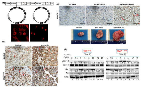 Next, we used a mouse xenograft model of melanoma to examine whether overexpression of nuclear BRAFV600E upregulates HMOX-1 protein expression. Stable clones of melanoma MV3 cells expressing BRAFV600E or NLS-BRAFV600E were subcutaneously inoculated into nude female mice (n = 5 for each group), and the animals were monitored for 5 weeks. Figure 3B and Figure S10 show that tumors generated by the BRAFV600E- and NLS-BRAFV600E-expressing MV3 cells were greater in size and displayed higher HMOX-1 expression compared to the wild-type control, as assessed by immunohistochemistry with a specific antibody to the mutant protein. As expected, Figure 3B shows that the NLS-expressing cells generated the largest size of tumor and much higher HMOX-1 protein. In BRAFV600E-injected mice (n = 5), HMOX-1 was only detected in 2 out of 5 (40%), while in NLS-BRAFV600E-injected mice (n = 5), HMOX-1 was detected in 4 out of 5 mice (80%). This result suggests that HMOX-1 protein expression could be mediated by the nuclear BRAFV600E.