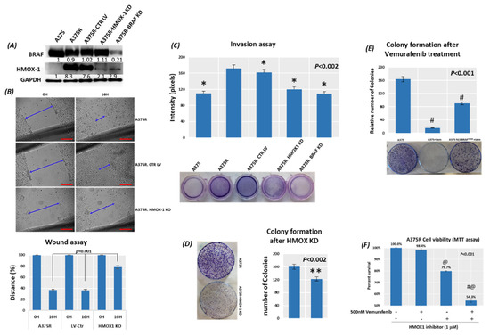 To address whether HMOX-1 reduction could interfere with melanoma aggressiveness, compromised HMOX-1 cell lines have been established and are correlated with melanoma-decelerated cell proliferation and invasion rate along with slower colony formation. Furthermore, an in vivo study showed a significant decrease in the number, size, and weight of tumors after knocking down HMOX-1. Remarkably, the A375 sensitive cells developed resistance when expressing NLS-BRAFV600E.