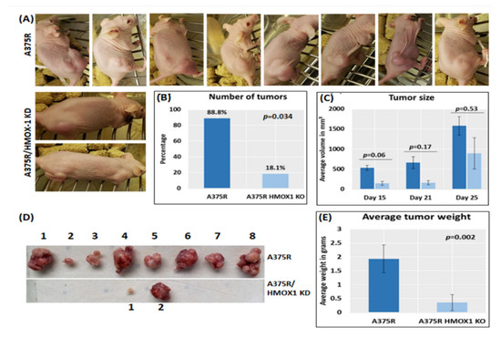 A375R cells with HMOX-1 knockdown or the parental cells were subcutaneously inoculated into nude female mice. Two groups of mice were used: n = 9 for the A375R cells and n = 11 for the HMOX-1 knockdown cells. Tumors started to develop after 19 days and were monitored twice a week for an extra 14 days. The results show that almost 90% of the A375R-injected mice developed a tumor (8 out of 9) compared to about 20% of the HMOX-1 knockdown mice (2 out of 11), as shown in Figure 5A,B. The growth rate of the tumors generated by HMOX-1 knockdown A375R cells was markedly slower than those expressing the A375R parental cells (Figure 5C). In addition, the average weight of tumors dropped in HMOX-1-knockdown-injected mice from 1.92 to 0.25 g (Figure 5D,E).