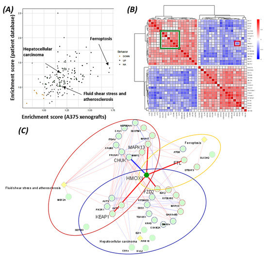 KEGG pathways analysis was independently performed on the A375 xenograft database and the melanoma patient database, and 161 signaling pathways were common in both databases (Figure 6A). Interestingly, three pathways contained HMOX-1, “ferroptosis”, “fluid shear stress and atherosclerosis”, and “hepatocellular carcinoma.” Ferroptosis is a newly discovered iron-dependent cell death process. Fluid shear stress and atherosclerosis are diseases characterized by the deregulation of PI3-AKT signaling, focal adhesion, NF-kappa B signaling, and MAPK signaling pathways. Finally, hepatocellular carcinoma is a cancer involving calcium, PI3K/AKT, p53, TGF-beta, Wnt, and MAPK signaling pathways. Interestingly, ferroptosis was the pathway with the highest enrichment score in xenografts and the only one to show a significant correlation with HMOX-1 in both databases (xenografts, rho = 0.79, p = 0.02; patients, rho = 0.39, p = 0.002). These observations suggest that HMOX-1 contributed significantly to the ferroptosis process during BRAF inhibition therapy resistance. From the three pathways containing HMOX-1, 36 genes were identified as significantly deregulated in the resistant models, compared to sensitive samples, in both databases. The 36 genes were enriched in the PI3K-AKT pathway (AKT1, AKT3, PI3KR1, PRKAA1, RPS6KB1, RPS6KB2), the MAPK pathway (KRAS, SOS1, MAPK13, MAPK3, MAPK7, MEF2A), iron metabolism (HMOX1, FTL, ATG5, STEAP3), the chromatin remodeling complex (ARID1B), cell cycle (CDK4, CDKN2A, E2F1, E2F2), the NF-kappa B pathway (CHUK, ITGAV), the WNT pathway (DVL2, FZD2), TGF-beta pathway (SMAD4, TGFBR1), and the antioxidative response (HMOX-1, GSMT3, KEAP1, SQSTM1). A correlation matrix (Figure 6B) identified a cluster of genes strongly positively associated with HMOX-1 (FTL and STEAP3, two ferroptosis genes, FZD2, MAPK13, and SQSTM1; highlighted with the green square on the heatmap) and one gene strongly negatively correlated (CHUK, with a red square on the heatmap). A network analysis emphasized the interdependence of the three pathways involving HMOX-1 (Figure 6C). The highest correlations observed with HMOX-1 in patients with melanoma were with FZD2 (rho = 0.54), KEAP1 (rho = 0.59), MAPK13 (rho = 0.68), the “ferroptosis” gene FTL (rho = 0.58), and CHUK (rho = −0.50).