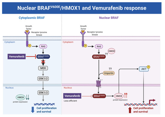 We reported for the first time in our previous study [24] a strong association between nuclear BRAFV600E expression and aggressive clinicopathologic features, including overall stage, tumor stage, lymph node metastasis, depth of invasion, Clark level, mitotic activity, and ulceration. In the same study, we reported that the SkMel-28 cell line (BRAFV600E) displays a dynamic nuclear localization of BRAFV600E, regulated by the removal or addition of FBS or epidermal growth factor (EGF) to the media. In contrast, and as we report in the current study (Figure S11), WT BRAF does not show any nuclear localization by immunofluorescence in the SKMel-202 melanoma cell line. In the literature, two studies mentioned a small fraction of WT BRAF in the nucleus. In the first study, an exogenous truncated BRAF transfected in NIH3T3 cells was used, and this artificial system cannot be generalized or applied to the endogenous BRAF. In the second study, Shin et al. used a non-cancer C2C12 myoblast cell line and found a very tiny fraction of WT BRAF in the nucleus compared to a strong nuclear presence of BRAFV600E [34,35]. Our hypothesis is that WT BRAF activation requires external growth factors, and its localization is totally cytoplasmic. The constitutively active BRAFV600E is independent of external stimulus, and the nuclear localization may provide the BRAFV600E with a sheltering mechanism against inhibitors, possibly through a novel and unexpected collaboration with overexpressed HMOX1. However, mechanistic studies are required for the validation and explanation of our previous findings. In this study, we report that A375R melanoma vemurafenib-resistant cells display a nuclear localization of BRAFV600E after synchronization and stimulation with the FBS. A 10-fold upregulation of HMOX-1 protein is observed in A375R cells with nuclear localization of BRAFV600E compared to A375 parental cells that have cytoplasmic BRAFV600E. Surprisingly, HMOX1 upregulation in A375R or WM983C cell lines is not the consequence of NRF2 protein overexpression (Figure S7). In another study, it was hypothesized that the existence of a possible HMOX-1 reserve in the form of mRNA to be transformed into protein when necessary [36]. Additionally, we show that HMOX-1 upregulation crucially limits the efficacy of the BRAF inhibitor PLX4032 and is important in promoting cell viability and aggressiveness. Our results provide the first evidence that nuclear BRAFV600E plays a critical role in the regulation of HMOX-1 protein overexpression in resistant melanoma cells. A recent study with a WT BRAF cell line (MeWO) showed neither basal expression nor induction of HMOX-1 after treatment with PLX4032 [37]. HMOX-1 is one of the most important mechanisms of cell adaptation to stress, and chemo- and radiotherapy both fundamentally stimulate HMOX-1 expression [38]. However, the transcriptional or post-transcriptional mechanisms controlling HMOX-1 expression in response to cytotoxic stress remain elusive. This study extends our understanding by identifying nuclear BRAFV600E as a potential player in HMOX-1 expression. The nuclear translocation and the molecular mechanism of nuclear BRAFV600E in promoting tumor progression and resistance is still poorly understood. Thus, to the best of our knowledge, the present study provides the first evidence of a possible role of nuclear BRAFV600E/HMOX-1/AKT in melanoma resistance. Figure 7 is a hypothetical model of how melanoma cells with nuclear BRAF and high HMOX-1 expression can activate the AKT pathway and resist vemurafenib treatment.