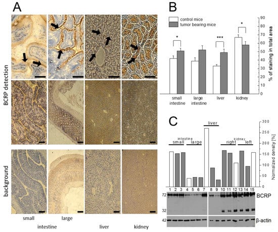 Immunohistochemical detection of BCRP in mouse normal tissues, distant from the tumor site: the assays were done on the small and large intestine, liver, and kidney tissues of DBA/2 mice bearing a S91 melanoma tumor at an advanced stage of growth (mass greater than 1 g; volume ≥1000 mm3), using an anti-BCRP monoclonal antibody (BXP-53). (A) Microscopic images of tissue slices stained with an anti-mouse HRP-DAB antibody (BCRP in brown, stained areas indicated with black arrows) and counterstained with hematoxylin (blue). Background slices were processed without primary antibody (see the text for details). Scale bar: 5 µm; (B) Quantitative analysis of BCRP-specific immunohistochemical staining of tissues from control mice and melanoma tumor-bearing mice at an advanced stage of growth. The graph shows the percentage of the stained area relative to the total area of the tissue slices (calculated as the surface of imposed binarization mask; see the text for details). The results are presented as a mean and standard error for the group of histological images. Statistical significance and sample size: small intestine: p = 0.053; n = 60, N = 6 in the control group and n = 20, N = 2 in the group of tumor-bearing mice; large intestine: * p < 0.05; n = 50, N = 5 in the control and n = 30, N = 3 for the group of tumor-bearing mice; liver: *** p < 0.001, n = 60, N = 6 in the group of mice with tumor; n = 30, N = 3 in the group of tumor-bearing mice; kidney: * statistical significance by t-test: p < 0.05, n = 60 (number of histological images analyzed), N = 6 (number of animals) in the control group and n = 40, N = 4 in the group of tumor-bearing mice; (C) The expression of BCRP in tissues from healthy and small-to-moderate melanoma tumor-bearing mice, estimated using Western blotting, using the BXP-53 antibody. In C, top, bars represent the mean values from duplicates (standard error does not apply) of the densitometric signal obtained by visualizing the blots, as normalized to β-actin level. Images were analyzed using the software Image-J (see the text for details). In C, bottom, a representative Western blot showing BCRP level in the tissues of healthy and tumor-bearing mice, visualized with a luminol and exposed to photographic film. Lane and bar designation: 1–3—the small intestine; 4–6—the large intestine; 7–9—liver; 10–12—right kidney; 13–15—left kidney; 1, 4, 9, 12, and 15—tissues from healthy mouse (control); 2, 3, 5–8, 10, 11, 13 and 14—tissues from tumor-bearing mice.
