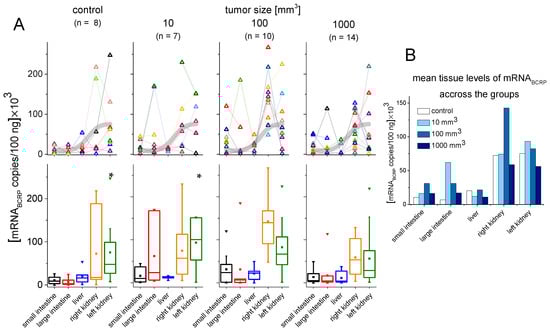 The correlations between the individual tissue levels of mRNABCRP and the tumor stage in each animal are shown in Figure 2A. In the control intestines and livers, the mRNABCRP levels are similarly low and show only a narrow spread of the values. They are higher in the other organs, but not in all individuals. In the tumor-bearing animals the differences and variations in the mRNABCRP levels become much more pronounced. In most organs the peak values are reached when the tumor size equals 100 mm3 and the mRNABCRP levels tend to decline in the animals with an advanced tumor (V ~1000 mm3), in some cases almost reaching the background level (~10000 copies/100 ng). The highest rise (~10-fold, statistically significant) is seen in the large intestine and in the right kidney (three–four-fold), when tumors reach small to medium volumes (10–100 mm3). Both kidneys show a high spread of mRNABCRP levels but similar differences are seen in the control. In the liver, a low level of mRNABCRP was consistently found, up to 50,000 copies/100 ng, showing no apparent effect of the tumor.