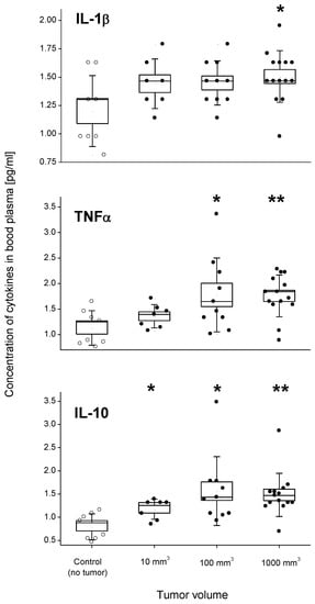The concentrations of inflammatory cytokines, IL-1β, TNFα, and IL-10 in serum of DBA/2 mice: Analysis was carried out in control animals (no tumor) and in the mice with subcutaneous S91 tumor at the early (size above 10 mm3), moderately advanced (size above 100 mm3), and advanced stage of growth (size above 1000 mm3). Cytokine concentrations were determined in blood plasma collected from the hearts of animals using a Luminex® analyzer (see the text for details). The range indicated by the box defines the mean ± standard error (SE), and that indicated by the error bars the mean ± standard deviation (SD). The horizontal line defines the median and the points indicate the values of the individual measurements. The statistical significance of the differences between the meanings, compared to the controls, was determined using the t test. * p < 0.05, ** p < 0.01. Compared to the healthy animals, the highest changes in the IL-1β and TNFα concentrations in the peripheral blood of tumor-bearing mice are statistically significant (p < 0.02 and 0.002, respectively).