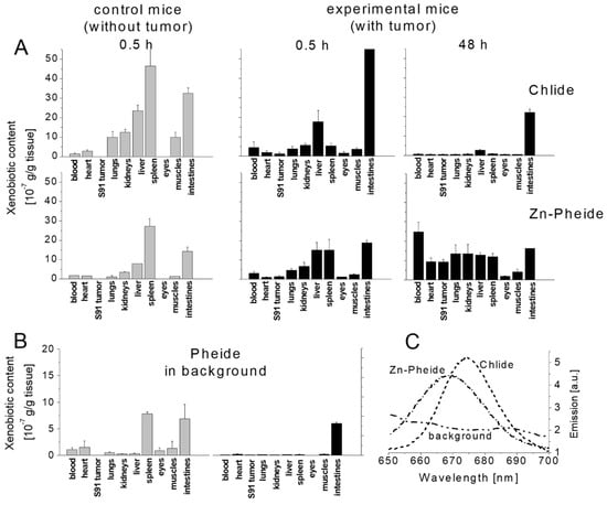 The model xenobiotics were i.p. administrated, each at a dose of 10 mg/kg body weight, in a group of healthy mice and mice bearing large tumors. Their tissue levels were examined at 0.5 h and 48 h after the injection to capture the short- and long-term effects. In the initial period, the levels of the two compounds in tumor-bearing mice, though slightly higher in the case of Chlide, are fairly comparable, whereas in healthy mice the differences are somewhat more pronounced (Figure 4A). Much larger differences are seen after 48 h, as Chlide clears almost completely from the tissues, while the clearance of Zn-Pheide is markedly slower, and, except for the intestine, its levels are about an order of magnitude higher than that of Chlide. The i.p. administrated xenobiotics near the tumor sites were also detected in vivo in a non-invasive manner, via transdermal recording of their fluorescence emission spectra using the method described previously []. The emission maxima located at 674 nm and 670 nm (Figure 4C) registered 1 h after xenobiotics were injected, which correspond to the positions of the emission bands of the monomeric Chlide and Zn-Pheide, respectively [], which suggest that spectral resolution of this technique is sufficiently high.