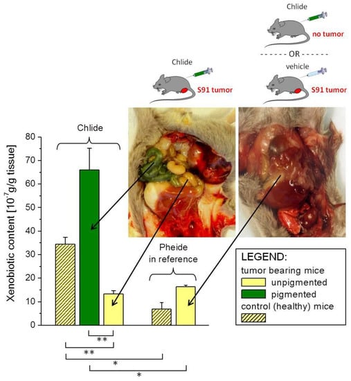In order to verify the systemic effects of the tumor on xenobiotic transport, the pharmacokinetics and efficiency of xenobiotic efflux in the melanoma tumor-bearing and healthy mice were investigated. To this end, Chlide and Zn-Pheide were used as model xenobiotics and the substrates for BCRP, and the levels of endogenous Pheide in tissues from healthy and tumor-bearing mice not treated with xenobiotics were compared.