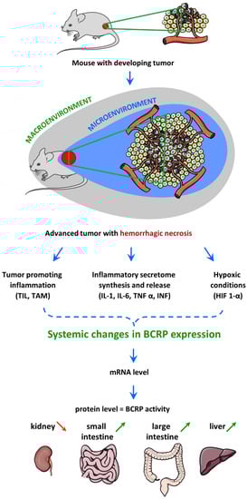 Schematic presentation of molecular pathways that link the systemic overexpression of BCRP with oncogenic stress: The tumor microenvironment is created by tumor cells and stroma, the infiltrating inflammatory cells, blood vessels, and other accompanying cells. During tumor growth an immune response leads to the release of cytokines (IL-1, IL-6, TNF-α, and INF) from the inflammatory and tumor cells. These pro-inflammatory mediators promote the recruitment of other inflammatory cells to the tumor site. The tumor-infiltrating leukocytes (TIL) and tumor-associated macrophages (TAM) secrete factors that cause immunosuppression and contribute to tumor growth. At the same time, necrotic foci are formed due to hypoxia in the growing tumor, which also stimulate the immune system. Locally synthesized growth factors, chemokines, and cytokines further promote tumor growth, allowing cancer cells to acquire angiogenic capacity, leading to migration and invasion of other tissues. Blood and lymph vessels are the key components that facilitate the supply of oxygen and nutrients to cancer cells and also transport active compounds produced by the tumor and the surrounding microenvironment, creating a tumor macroenvironment. The cytokines and other factors associated with inflammation and hypoxia may affect this way the expression of BCRP in distant tissues.
