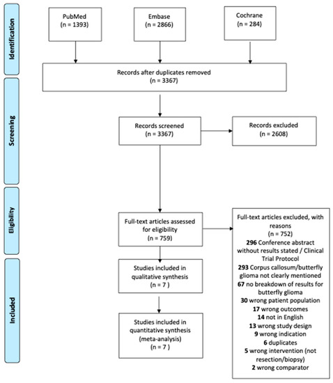 A total of 3367 studies were identified during the initial search. Of those, 2608 were excluded in title and abstract screening. After full text review, 752 studies were excluded as shown in Figure 1. Seven [2,3,6,16,17,18,19] unique studies were eligible for the meta-analysis including 293 patients with butterfly glioblastomas. Both univariate and multivariate hazard ratios (adjusted for age, Karnofsky Performance Status at diagnosis, and pre-operative tumor volume) were available in one study [6], while univariate hazard ratios were derived from median survival times for six studies [2,3,16,17,18,19].