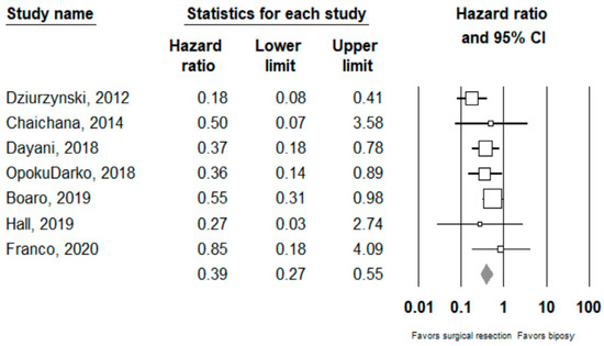 Forest plots showing hazard ratios of surgery vs biopsy for overall survival. Each study is shown by the point estimate of the hazard ratio and 95% confidence intervals (extending lines). The diamond center represents the estimated pooled hazard ratio and the width represent its 95% confidence interval (labelled total).