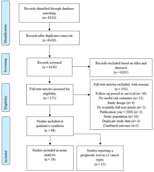 The literature search identified 6436 unique studies, of which 6265 were excluded based on their title and abstract (Figure 1). A total of 171 studies were screened for full text. Eventually, a total of 68 studies were systematically interpreted and summarized in the qualitative synthesis, whereupon 39 studies were included in the meta-analysis.