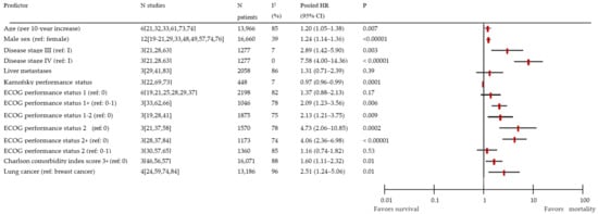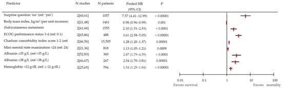 The following are available online at https://www.mdpi.com/article/10.3390/cancers14020328/s1, Table S1: Search strategy for the online databases, Table S2: Domains and items for risk-of-bias assessment, Table S3: Hazard ratios for mortality based on studies with low risk-of-bias, Table S4: Variables not included in the meta-analysis, Figure S1: Forest plots per individual predictor using random-effects model, Figure S2: Funnel plots.
