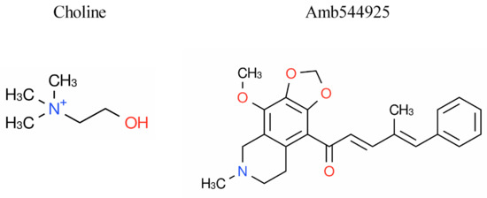 Chemical structure of choline (2-hydroxyethyl(trimethyl)ammonium), Amb544925 (1-(4-methoxy-6-methyl-5,6,7,8-tetrahydro-[1,3]dioxolo[4,5-g]isoquinolin-9-yl)-4-methyl-5-phenyl-penta-2,4-dien-1-one).