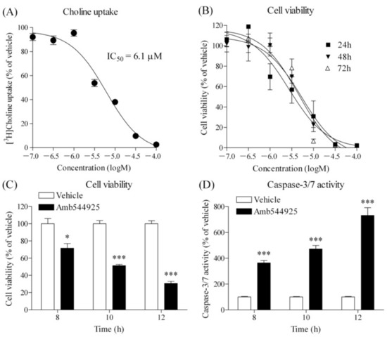 3.2. Effects of Amb544925 on Choline Uptake, Cell Survival and Caspase-3/7 Activity
