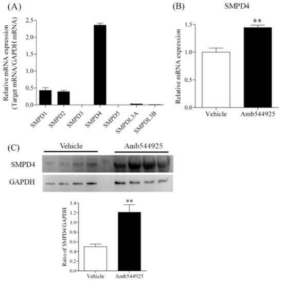 Effect of Amb544925 on SMPD4 expression in HSC-3 cells. (A) The mRNA expression patterns of seven different SMPD isoforms in HSC-3 cells (n = 3). Relative mRNA expression is expressed as the ratio of each target mRNA to the amount of GAPDH mRNA. (B) Effect of Amb544925 on SMPD4 mRNA expression in HSC-3 cells (n = 3). Cells were preincubated with 30 µM Amb544925 for 2 h, and then cell viability and caspase-3/7 activity were measured simultaneously. Cells were preincubated with 30 μM Amb544925 for 2 h, and then SMPD4 mRNA expression was measured by real-time PCR. The expression level of SMPD4 mRNA was expressed as the ratio of the expression level of Amb544925 treatment to that of the vehicle control. (C) Effect of Amb544925 on SMPD4 protein levels in HSC-3 cells (n = 4). Cells were preincubated with 30 μM Amb544925 for 2 h, and then whole cell proteins were extracted. Representative immunoblots and densitometric analysis for SMPD4 in lysates of HSC-3 cells treated with 30 μM Amb544925 for 2 h. Each column represents the densitometric measurement of SMPD4 protein normalized to GAPDH. The densitometric data are presented as the means ± SD (n = 4). ** p < 0.01 compared to the vehicle control.