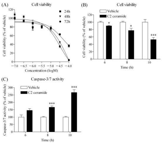 Effects of C2 ceramide on cell viability and caspase-3/7 activity in HSC-3 cells. (A) Effect of C2 ceramide on cell viability (n = 3). Cells were preincubated with each concentration of C2 ceramide for 24, 48, and 72 h, and then cell viability was measured. Results are presented as a percentage of the vehicle control. Effect of 50 µM C2 ceramide on cell viability (B) and caspase-3/7 activity (C) in HSC-3 cells (n = 4). Cells were incubated with 50 µM C2 ceramide for 6, 8, and 10 h, and then cell viability and caspase-3/7 activity were measured simultaneously. Results are presented as a percentage of the vehicle control. * p < 0.05 and *** p < 0.005 compared to the vehicle control.