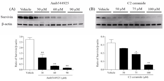 Survivin is a member of the apoptosis suppressor family and is involved in the suppression of apoptosis and regulation of the cell cycle [20], and is highly expressed in OSCC. In contrast, the normal oral epithelium did not express survivin [21]. We therefore examined the effect of Amb544925 on survivin expression and whether the alteration of survivin expression is involved in the induction of apoptosis by C2 ceramide. The treatment of HSC-3 cells with 30, 60 or 90 µM Amb544925 for 8 h dramatically suppressed survivin expression in a concentration-dependent manner (Figure 5A). Similarly, 50, 75 or 100 µM C2 ceramide dramatically suppressed survivin expression after 8 h of treatment (Figure 5B).