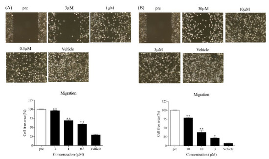 Effect of Amb544925 and C2 ceramide on HSC-3 cell migration. Cell migration assays were performed using culture-inserts. After cells were incubated with various concentrations of Amb544925 (A) and C2 ceramide (B) for 24 h, images of cell-free areas were acquired by digital microscopy (n = 4). Cell-free area (%) is expressed as percentage reduction relative to the cell-free area before drug administration (pre). * p < 0.05 and ** p < 0.01 compared to the vehicle control.