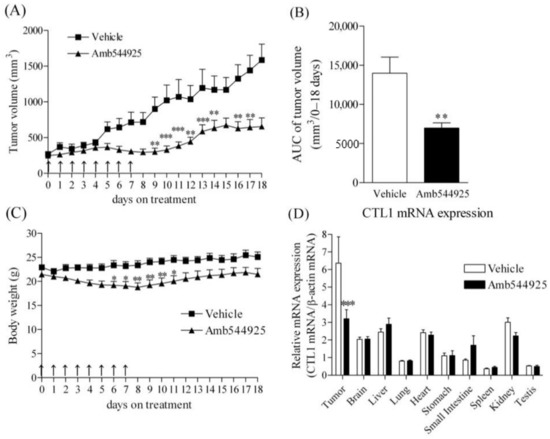 Effect of Amb544925 on tumor growth, body weight changes, and CTL1 mRNA expression in the HSC-3 human tongue cancer xenograft mouse model. (A) Tumor volumes were measured after intraperitoneal administration of 10 mg/kg Amb544925 (n = 8 mice) and vehicle control (n = 8 mice). The date of drug administration is indicated by an arrow. ** p < 0.01 and *** p < 0.005 compared to the vehicle control. (B) Area under curve (AUC) of tumor volume in each group over 0–18 days (n = 8 mice). ** p < 0.01 compared to the vehicle control. (C) The body weight of mice was measured at the time of drug administration (n = 8 mice). * p < 0.05 and ** p < 0.01 compared to the vehicle control. (D) Effect of Amb544925 on CTL1 mRNA expression in the tumor, brain, liver, lung, heart, stomach, small intestine, spleen, kidney, and testicles in the HSC-3 human tongue cancer xenograft mouse model. Relative mRNA expression is expressed as the ratio of CTL1 mRNA to β-actin mRNA in each tissue (n = 8 mice). *** p < 0.005 compared to the vehicle control.