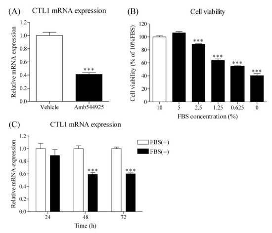 Effect of Amb544925 and FBS on CTL1 mRNA expression in HSC-3 cells. (A) Cells were incubated with 10 μM Amb544925 for 24 h, and then CTL1 mRNA expression was measured by real-time PCR (n = 4). The expression level of CTL1 mRNA was expressed as the ratio of the expression level of Amb544925 treatment to that of the vehicle control. *** p < 0.005 compared to the vehicle control. Effect of FBS on cell viability (B) and CTL1 mRNA expression (C) in HSC-3 cells (n = 4). The cell viability of HSC-3 cells cultured in medium containing various concentrations of FBS for 48 h was measured. Results are given as a percentage of cell viability measured in the presence of 10% FBS. *** p <0.005 compared to 10% FBS. (C) Effect of FBS on CTL1 mRNA expression in HSC-3 cells (n = 4). Cells were cultured in the presence (FBS+) and absence (FBS−) of 10% FBS for 24, 48, and 72 h, and then CTL1 mRNA expression was analyzed by real-time PCR. *** p < 0.005 compared to 10% FBS (FBS+).