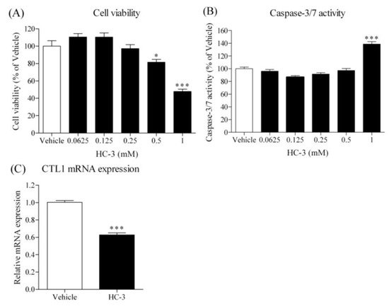 Hemicolinium-3 (HC-3) is a CTL1-mediated choline uptake inhibitor, and its effect in cancer cells was previously reported [13,15,16]. The effect of HC-3 on the viability of HSC-3 cells was examined, and it inhibited the cell viability in a concentration-dependent manner (Figure 9A). On the other hand, a high concentration of HC-3 (1 mM) significantly increased caspase-3/7 activity (Figure 9B). Furthermore, HC-3 significantly decreased the expression of CTL1 mRNA in HSC-3 cells (Figure 9C).