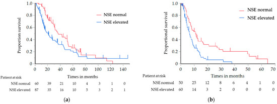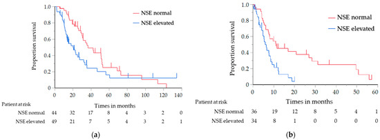 The OS of the elevated NSE level group was significantly shorter than that of the normal NSE level group (median, 20.3 vs. 36.8 months; log-rank test p = 0.029, hazard ratio (HR), 1.55; 95% confidence interval (CI), 1.04–2.31 (Cox proportional hazard model)) (Figure 1a). The PFS with first-line chemotherapy was also significantly shorter in the elevated NSE level group than in the normal NSE level group (median, 6.4 vs. 11.0 months; log-rank test p = 0.001; HR, 2.04; 95% CI, 1.31–3.18) (Figure 1b). There were no significant differences in the OS and PFS among the other tumor markers. After stratification based on the NSE level, the patient characteristics were found to be well-balanced; these are summarized in Table S1.