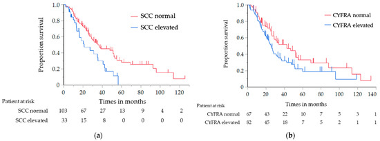 The results of the analysis of the OS and PFS, in which the histological type was limited to SCC only, are shown in Table 4. Similar to the results of the previous analysis, the OS of the elevated NSE level group was significantly shorter than that of the normal NSE level group (median, 20.3 vs. 36.8 months; log-rank test p = 0.030; HR, 1.71; 95% CI, 1.05–2.80) (Figure 2a). The PFS with first-line chemotherapy was also significantly shorter in the elevated NSE level group than in the normal NSE level group (median, 5.9 vs. 11.0 months; log-rank test p = 0.001; HR, 2.52; 95% CI, 1.41–4.59) (Figure 2b). For the other tumor markers, the OS of the elevated CYFRA and SCC antigen level group was significantly shorter than that of the normal CYFRA and SCC antigen level group (CYFRA level: median, 25.7 vs. 42.7 months; log-rank test p = 0.047; HR, 1.52; 95% CI, 1.01–2.33; SCC antigen level: median, 21.1 vs. 33.9 months; log-rank test p = 0.018; HR, 1.79; 95% CI, 1.08–2.87) (Figure 3a,b); however, the PFS did not significantly differ between them.