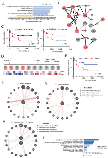Identification of proteins associated with survival through univariate and multivariate Cox regression analysis. (A) The list of proteins identified as associated with survival through univariate Cox regression analysis (n = 41) was used for Gene Set Enrichment Analysis (GSEA) using WEB-based GEne SeT AnaLysis Toolkit (WebGestalt) with Wikipedia cancer pathway as enrichment categories. The enriched categories are shown. (B) Network topology-based analysis for the same list of proteins was run using TCGA RNA Seq data for DLBCL samples as the functional database. The identified network was found to be enriched for numerous Gene Ontology (GO) categories, including immune system development (proteins included in this subnetwork are shown). (C) Kaplan–Meier curves of OS in patients (n = 47) subdivided into two groups on the basis of ETV6 protein expression levels (left panel) or PIM2 protein expression levels (right panel). High: >median value; low: ≤median value. (D) Unsupervised hierarchical clustering of DLBCL samples using ETV6 and PIM2 proteins. (E) Kaplan–Meier curves of OS in the two clusters (Cluster 1 and 0) identified using ETV6 and PIM2 protein levels. (F) Biological interaction network of ETV6 showing physical interactions obtained using GeneMANIA. (G) Biological interaction network of PIM2 showing physical interactions and associated functional pathways obtained using GeneMANIA. (H) Biological interaction network of ETV6 and PIM2 showing physical interactions and associated functional pathways obtained using GeneMANIA. (I) Over representation analysis (ORA) of ETV6 interacting proteins using Reactome pathways as functional database.