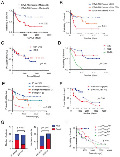 We subsequently proceeded to validate our main findings in an independent cohort of DLBCL patients (n = 49 of which 39 resulted informative) using IHC (Figure 3F) given the low number of proteins for evaluation (n = 2) and its possible subsequent routine clinical application. We found that lymphoma patients with high ETV6/PIM2 ratios (>1) had a worse outcome compared to patients with low ETV6/PIM2 ratios (<1; p = 0.01; Figure 3F). This ratio was more effective in predicting survival compared to single proteins (ETV6 (staining intensity > 1; Chi-square, two sided p = 0.07) and PIM2 (staining intensity < 2; Chi-square, two sided p < 0.01)) (Figure 3G,H).