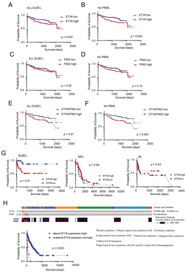 High ETV6 or ETV6/PIM2 levels predict poor survival in B-cell lymphomas. Kaplan–Meier survival curves of the entire series of 223 DLBCL patients [25], analysed as a group (A) or excluding PBML cases (B). ETV6 (probe 235056_at) high cases (>median expression) or ETV6 low cases (<median expression). Kaplan–Meier survival curves of the entire series of 223 DLBCL patients [25], analysed as a group (C) or excluding PBML cases (D). PIM2 (probe 204269_at) high cases (>median expression) or PIM2 low cases (<median expression). Kaplan–Meier survival curves of the entire series of 223 DLBCL patients [25], analysed as a group (E) or excluding PBML cases (F). High ETV6/PIM2 ratio (>median level) or low ETV6/PIM2 ratio cases (<median expression). (G) Kaplan–Meier survival curves of a series [26] of DLBCL patients (left panel), mantle cell lymphoma (MCL) patients (middle panel) or Burkitt lymphoma (BL) patients (right panel). ETV6 high cases (>median expression) or ETV6 low cases (<median expression). (H) OncoPrint in cBioPortal identified ETV6 high expressors (>2 mean expression Z score) across the B-cell lymphoma subtypes [26] (top panels), and these cases are associated with poor survival (bottom panel).