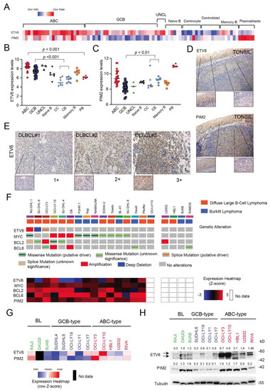ETV6 expression in malignant B-cells compared to normal B-cell subsets. (A) Heat map representation of ETV6 and PIM2 transcript levels in DLBCL samples and normal tonsil B-cell subsets [29]. (B) Comparison of ETV6 transcript levels between DLBCL subgroups (ABC, GCB and UNCL) and normal B-cell subsets obtained from tonsils. For statistical analysis, an unpaired t-test was used. (C) Comparison of PIM2 transcript levels between DLBCL subgroups (ABC, GCB and UNCL) and normal B-cell subsets obtained from tonsils. CC = centrocytes; CB = centroblasts; PB: plasmablasts. For statistical analysis, a nonparametric t-test was used. (D) ETV6 immunohistochemical staining of reactive tonsil (top): original magnification (×10) and 40× (insets). PIM2 immunohistochemical staining of reactive tonsil (top): original magnification (×10) and 40× (insets). (E) Immunohistochemical staining for ETV6 in representative cases of DLBCL patients showing low (+1), medium (+2) and high (+3) expression levels. Original magnification ×20; inset ×40. (F) OncoPrint visualization in cBioPortal of genetic alterations (top) affecting ETV6, MYC, BCL2 and BCL6 genes for selected B-lymphoma cell lines (source: Cancer Cell Line Encyclopedia (Broad, 2019) and Lymphoma cell lines (MSKCC,2020)). Heat map showing gene expression levels of selected genes is also depicted (bottom). (G) Heat map representation of relative ETV6 and PIM2 transcript levels (normalized to RPL19 housekeeping gene) in available B-cell lymphoma cell lines as determined by qRT-PCR. (H) Evaluation of ETV6 and PIM2 and protein expression levels in DLBCL cell lines of different molecular subtypes (ABC and GCB-type) and Burkitt lymphoma (BL) cell lines using immunoblotting. Tubulin is shown as loading control. Relative protein expressions (normalized to loading control) are shown on top of appropriate panels. kD = kilodaltons.