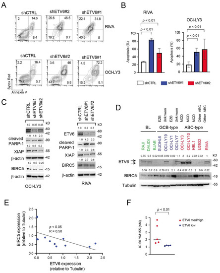 Given the unknown function of ETV6 in mature B-cell lymphomas and our results suggesting that high ETV6 expression may be relevant for the pathogenesis of highly aggressive DLBCL cases, we performed knock-down (KD) experiments in numerous cell lines expressing significant levels of ETV6, such as OCI-Ly3, RIVA, U2932 (all ABC-type), OCI-Ly19 (GCB-type) and RAJI (BL). To this end, cell lines were transduced with two different hairpins targeting ETV6 (shRNA ETV6#1 and shRNA ETV6#2) and an untargeted hairpin (shRNA CTRL) as control. We found that ETV6 knockdown (KD) determined a marked increase in apoptosis in all cell lines tested (Figure 6A,B and Figure S5A,B). The increase in apoptotic cells (AnnexinV+ ± Sytox Red+) was associated with increased PARP-1 cleavage (Figure 6C) and reduced expression of anti-apoptotic proteins such as survivin (BIRC5) and XIAP (Figure 6C and Figure S5C).