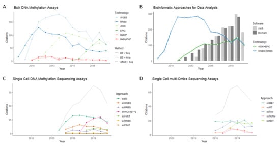 Popularity (Pubmed Citations) of DNA methylation approaches. (A) Bulk DNA methylation assays. (B) Experimental and bioinformatic approaches for bisulfite sequencing (WGBS + RRBS) and bisulfite arrays (450K and EPIC). Bismark, popular BS-seq analysis tool; Minfi, popular microarray analysis tool. (C) Single-cell DNA methylation sequencing assays. (D) Single-cell multi-omics sequencing assays.