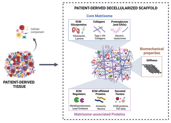 Patient-derived decellularized scaffold as a suitable tool for studying tumor–stroma interactions. The decellularization process of patient-derived tissue allows the efficient removal of the cellular component of the ECM, maintaining the 3D structure, as well as the biochemical categories (core matrisome and matrisome-associated proteins), according to Naba et al. [150], and biomechanical properties (stiffness). Created with BioRender.com (accessed on 10 November 2021).
