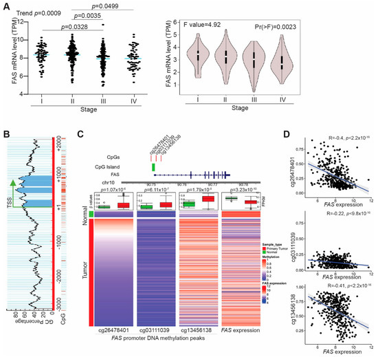 FAS is silenced by its promoter DNA hypermethylation in human colorectal cancer. (A) FAS mRNA data in human colorectal tumor were extracted from TCGA (left panel) and GEPIA (right panel) databases and grouped based on tumor stages. (B) The FAS promoter region showing CpG islands surrounding the FAS gene transcription start site. (C) Top panel (Left): The FAS promoter CpG island and three CpG sites significantly differentially methylated in TCGA colorectal cancer samples. Bottom panel (Left): Heatmaps of 450K DNA methylation array data of three CpG sites (cg26478401, cg03111039, cg13456138) and FAS expression (FPKM values) generated from TCGA human colorectal cancer datasets. The three columns on the left represent the beta values of the three CpG sites in primary colorectal cancer patient samples and normal colon tissues. The fourth column on the right shows the FPKM values of FAS RNA-seq data. The box plot on top of each heatmaps summarize the statistical difference between normal and tumor samples for CpG site methylation and FAS mRNA expression. The p-values indicate the Welch’s t-test results. (D) Negative correlation between methylation of the three CpG sites as shown in B of the left three columns and FAS mRNA expression as shown in B of the right column.