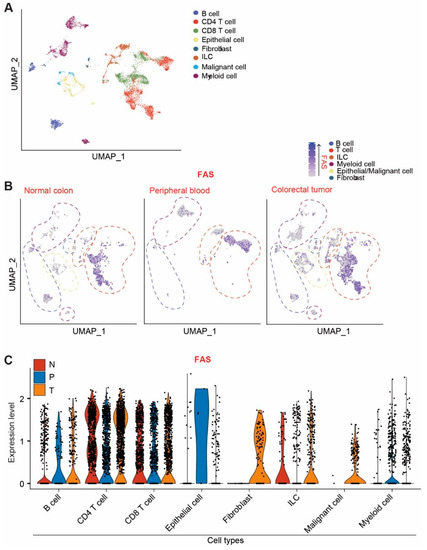 FAS expression profiles at the single-cell level in human colorectal-cancer patients. (A) UMAP projection of human colorectal-cancer scRNA-seq data. Original datasets were extracted from GSE146771 dataset. Cells are annotated according to dataset designation. (B) UMAP projection of FAS expression. Cells were subsetted by tissue of origin (normal colon, peripheral blood, and colorectal tumor). (C) FAS expression level in the indicated cell types in normal colon (N), peripheral blood (P), and colorectal tumor (T).