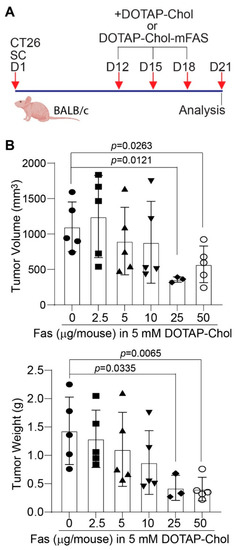 Dose response of mouse colon tumor to DOTAP-Chol-mFAS in tumor-bearing mice. (A) CT26 cells were injected to mice subcutaneously. Shown is the study design. (B) Tumor-bearing mice were randomized into six groups and treated with DOTAP-Chol-mFAS nanoparticle with various codon-usage-optimized mouse FAS cDNA-expressing plasmid doses as indicated. Tumor size and weight were analyzed at the end of the experiments.