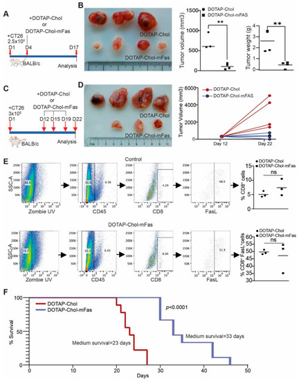In human clinical trials, DOTAP-Chol was used as a control [43]. To be consistent with this clinical practice for future clinical use, DOTAP-Chol was used as control in this study. We next treated tumor-bearing mice at the early stage (Figure 5A). One dose of DOTAP-Chol-mFAS treatment significantly suppressed tumor growth (Figure 5B). We then allowed the tumor to grow to a larger size before the treatment and treated the tumor-bearing mice three times with DOTAP-Chol-mFAS (Figure 5C). DOTAP-Chol-mFAS also significantly suppressed growth of the established large tumors (Figure 5D). Tumor tissues were then collected and analyzed for CD8+ T cell-tumor infiltration and FASL expression. As expected, no significant change in tumor-infiltration CTL level was observed, and approximately 50% of the colon tumor-infiltrating CTLs are FASL+ (Figure 5E). To further determine the function of FAS in colon-tumor suppression, we used an experimental lung-metastasis mouse model by injecting CT26 cells into mouse-tail veins. The tumor-bearing mice were treated with DOTAP-Chol-mFAS every three days three times. Mice in the control group had a median survival of 23 days. Mice in the treatment group had a median survival of 33 days (Figure 5F). Taken together, we determined that DOTAP-Chol-mFAS therapy is sufficient to suppress colon-tumor growth in vivo.
