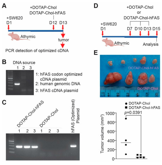 To determine the delivery efficiency of hFAS cDNA to the tumor site, we treated the xenograft-bearing mice with DOTAP-Chol-hFAS nanoparticles, collected tumor tissues one day later, isolated genomic DNA, and performed PCR using a pair of PCR primers that are specific for the codon-optimized human FAS cDNA sequence (Figure 7A). This PCR specifically detects the codon-sequence-optimized hFAS cDNA, not the endogenous FAS gene (Figure 7B). High levels of exogenous FAS were detected in the xenografts from mice treated with DOTAP-Chol-hFAS (Figure 7C), indicating efficient delivery of the codon-usage-optimized FAS cDNA to the tumor site. We then established human colon tumor xenografts and treated the tumor-bearing mice with DOTAP-Chol-hFAS as shown (Figure 7D). DOTAP-Chol-hFAS therapy is sufficient to suppress the xenograft tumor growth in vivo (Figure 7E).
