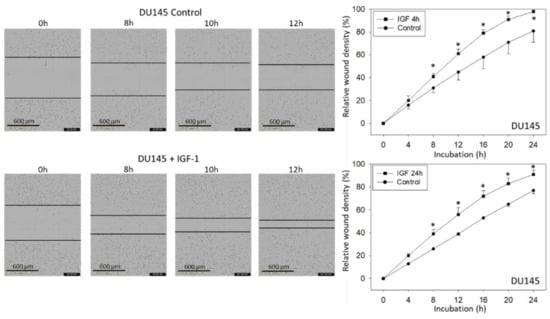 Motile crawling of DU145 and PC3 cells treated with IGF-1 (versus controls). The upper left side shows photomicrographs of the DU145 scratch assay taken after 0 (start), 8, 10, and 12 h (related to 4 h IGF-1 pre-stimulation). The upper right side shows the results from the quantitative calculation expressed as relative wound density (4 and 24 h pre-stimulation). DU145 were grown in 2% FBS. Lower panels: Relative wound density of DU145 cells following 4 or 24 h IGF-1 pre-stimulation and cultivation in 10% FBS, and relative wound density of PC3 cells stimulated with IGF-1 for 24 h and cultured in 2 or 10% FBS. Mean values of three experiments are shown. * indicates significant up-regulation compared to untreated controls (n = 3).