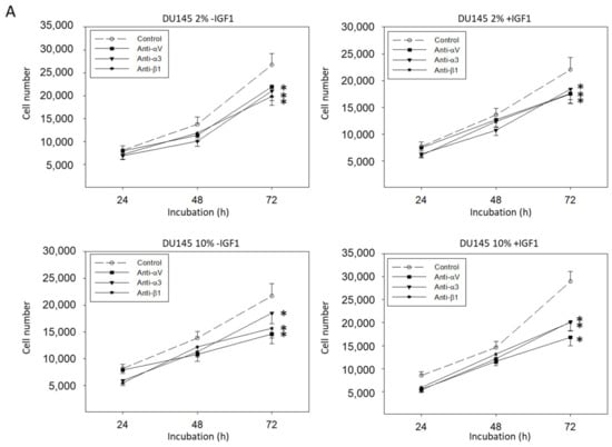 (A) DU145 cell number in response to integrin blockade. Tumor cells were grown in 2 or 10% FBS and in the presence or without IGF-1. Untreated cells served as controls. Cell number was evaluated after 24, 48, and 72 h by the MTT assay. (B) Chemotactic movement of DU145 cells after blockade through monoclonal antibodies (specific blockade against α3, αV, or β1) with or without IGF-1 activation. (C) Adhesion modulation of DU145 through integrin β1 blockade in the presence of 2 versus 10% FBS. (B,C) are related to the non-blocked controls set to 100%. Error bars indicate standard deviation. Experiments were repeated three times. One representative experiment is shown. * indicates p < 0.05.