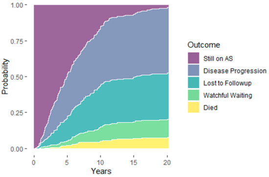 Here, we found that (a) the likelihood of remaining on AS for 20 years is below 3%, with a less than 50% chance of progression in that time, (b) the probability of LTF goes up the longer someone remains enrolled on AS, and (c) after five years, nearly two-thirds of patients benefitted from delaying active treatment by remaining on AS, switching over to WW, or dying of causes other than PCa, while one-third of patients required definitive treatment after five years on AS. Again, many of these conclusions were also observed by others, albeit over shorter study durations.