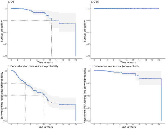 (a) OS at 92.3%, the dashed line shows the first quartile of 12.5 years; (b) CSS at 99.7%; (c) Survival and no reclassification probability, the dashed lines show the first quartile (4.5y) and median (10.5y); (d) Recurrence free survival rate at 89.8% (whole cohort). CI in light grey.