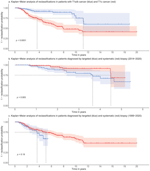 (a): Kaplan–Meier analysis of reclassifications in patients with T1a/b cancer (blue) and T1c cancer (red): 25% of the patients are reclassified within 3.6y (T1c) and 11.2y (T1a/b). A total of 95% CI in light blue and light red, (b): Kaplan–Meier analysis of reclassifications in patients diagnosed by targeted (blue) and systematic (red) biopsy using the data from 2014–2020: 25% of the patients are reclassified within 3.6y (targeted) and 4.5y (systematic) (c): Kaplan–Meier analysis of reclassifications in patients diagnosed by targeted (blue) and systematic (red) biopsy using the data from 1999–2020.