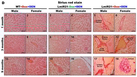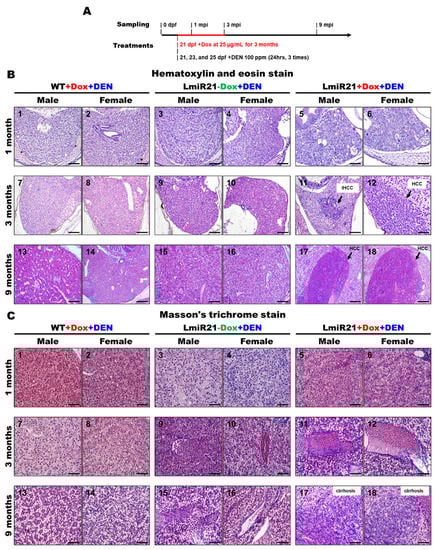 Increased susceptibility of LmiR21 zebrafish to diethylnitrosamine (DEN)-induced liver fibrosis and carcinogenesis. (A) Experimental design of three independent DEN treatments and doxycycline (Dox) dosing. (B) Representative images of livers with microscopic tumors identified following hematoxylin & eosin staining (indicated with arrows) one, three, and nine months after DEN treatment. Scale bar: 100 μm. (C) Representative images of livers with microscopic injuries identified by Masson’s trichome staining at one, three, and nine months after DEN treatment. Scale bar: 50 μm. (D) Representative images of livers with microscopic injuries identified by Sirius red staining at one, three, and nine months after DEN treatment. Scale bar: 50 μm.