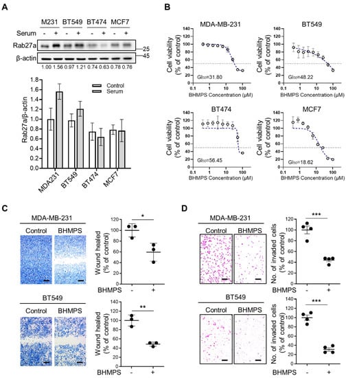 To confirm the antimetastatic potential of BHMPS, a new synthetic compound that can inhibit Rab27a expression [14], we first verified Rab27a expression in breast cancer cell lines with different subtypes, including MDA-MB-231 and BT549 for TNBC, BT474 for luminal B, and MCF7 for luminal A molecular subtypes. Intrinsic expression of Rab27a protein was higher in MDA-MB-231 and BT549 cells than in BT474 and MCF7 cells (Figure 1A). Moreover, serum stimulation further increased Rab27a expression in the TNBC cells. Next, the effect of BHMPS on cell viability was evaluated using the MTT assay (Figure 1B). MCF7 cells showed the lowest 50% growth inhibition (GI50) value of 18.62 µM, whereas BHMPS below 10 µM did not inhibit the growth of other breast cancer cells. Treatment of BHMPS at a non-cytotoxic dose of 10 µM significantly inhibited the migratory and invasive ability of MDA-MB-231 and BT549 cells with high expression of Rab27a (Figure 1C,D).