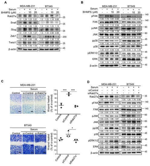 To investigate the underlying mechanism of the antimetastatic potential of BHMPS, several signaling molecules involved in invasion and metastasis were examined. BHMPS inhibited the expression of target molecule Rab27a in MDA-MB-231 and BT549 cells (Figure 2A). Additionally, BHMPS effectively decreased the levels of serum-stimulated EMT-activating transcription factors, including Snail, Slug, Zeb1, and Twist1, which are highly related to cancer migration and invasion [15]. Consistent with previous findings that FAK and mitogen-activated protein kinase (MAPK) signaling play essential roles in cancer cell proliferation and metastasis [16,17], FAK, JNK, p38, and ERK1/2 phosphorylation was significantly increased by serum stimulation in both cells, and BHMPS treatment markedly inhibited the phosphorylation of these molecules, especially FAK and JNK (Figure 2B).