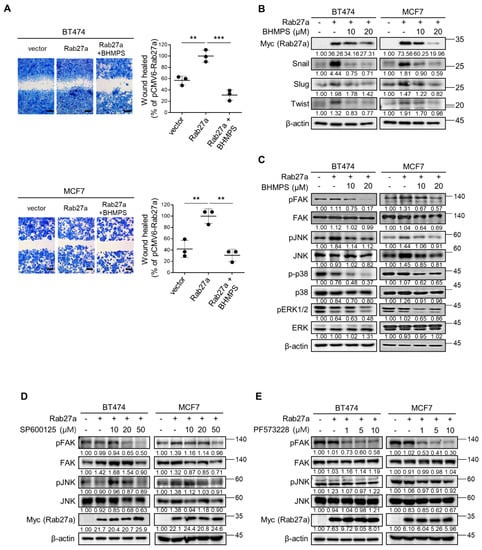 Rab27a overexpression promotes breast cancer cell migration. (A) BT474 and MCF7 cells were transfected with control or Rab27a expression vector. After 24 h, the cells were treated with 10 µM of BHMPS, and the percentage of migrated cells was determined. Statistically significant differences are shown in comparison with the Rab27a overexpression group. Representative images (40× magnification, Scale bars 250 µm) and means ± SD are from three independent experiments. ** p < 0.01 and *** p < 0.001 compared with Rab27a overexpression control. (B) BT474 and MCF7 cells were transfected with Rab27a-Myc-DDK expression vector. After 24 h, the cells were treated with the indicated concentrations of BHMPS for 24 h. The immunoblots show the expression of EMT-activating transcription factors. (C) Under the same experimental conditions as (B), FAK and MAPK signaling was determined by western blotting. (D,E) After 24 h of Rab27a overexpression, cells were treated with the indicated concentrations of JNK inhibitor (SP600125) or FAK inhibitor (PF573228) for 4 h. The uncropped images are shown in Supplementary Materials.