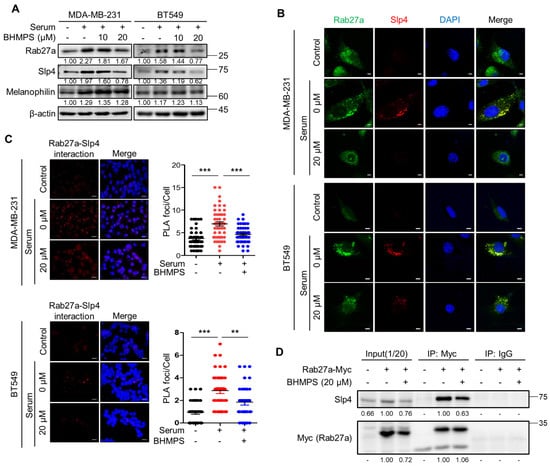Rab27a can bind to multiple factors and interact with specific effectors tailored to a particular biological setting [18]. Given that Rab27a interacts with Slp4 and Mlph in breast cancer cells [19], the expression of the two effector molecules was examined. In MDA-MB-231 and BT549 cells, serum stimulation significantly increased the expression of Slp4 and Mlph, along with that of Rab27a. However, BHMPS significantly decreased the expression of Slp4 in a dose-dependent manner compared with that of Mlph (Figure 4A). Therefore, we further examined the interaction between Rab27a and Slp4. As shown in Figure 4B, serum stimulation increased the expression of both Rab27a and Slp4 and their co-localization. Additionally, the number of PLA foci visualized as red fluorescent dots was increased by serum stimulation, indicating that there is an interaction between Rab27a and Slp4. As expected, BHMPS treatment reduced this phenomenon (Figure 4C). To confirm the direct interaction between Rab27a and Slp4, immunoprecipitation was performed using Rab27a-overexpressing MDA-MB-231 cells because the intrinsic levels of Rab27a were insufficient to detect molecular binding. BHMPS treatment decreased the precipitation of Slp4 compared with that of Rab27a-Myc, indicating that BHMPS inhibited the binding of Rab27a and Slp4 in breast cancer cells (Figure 4D).